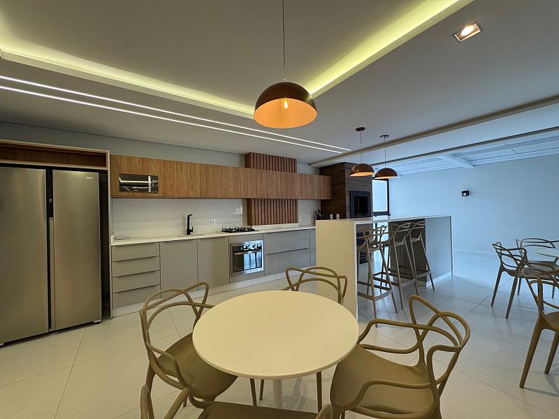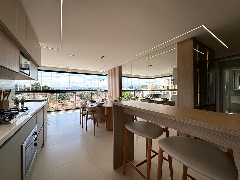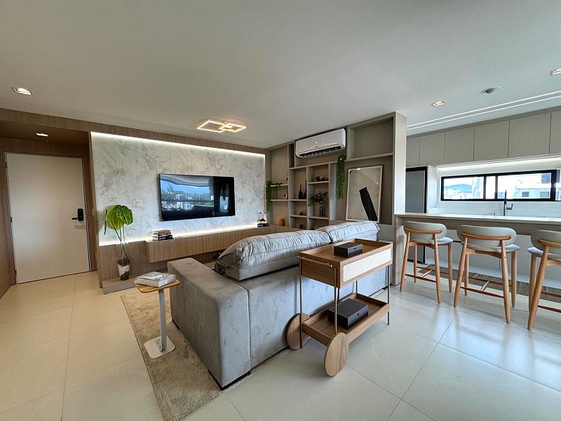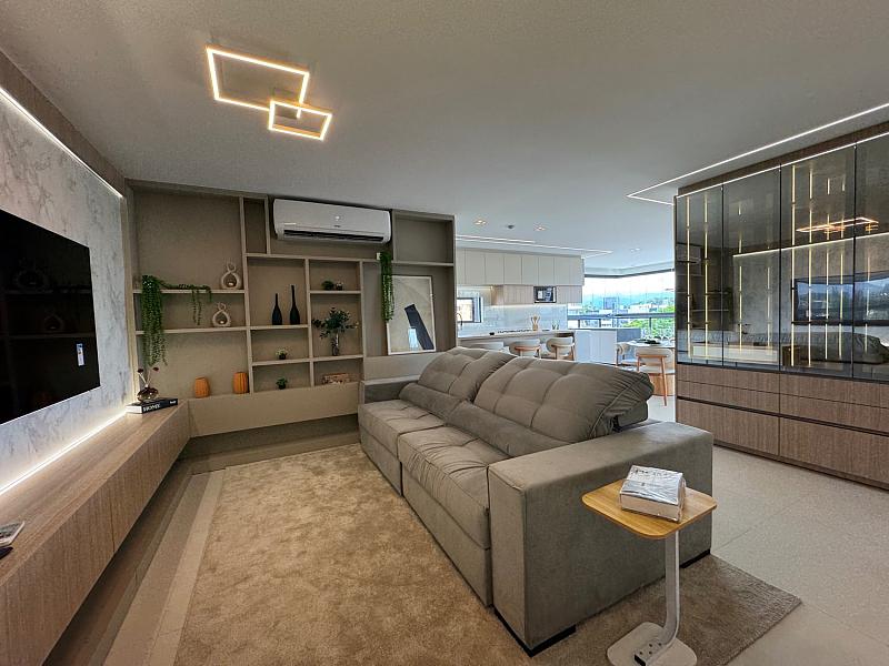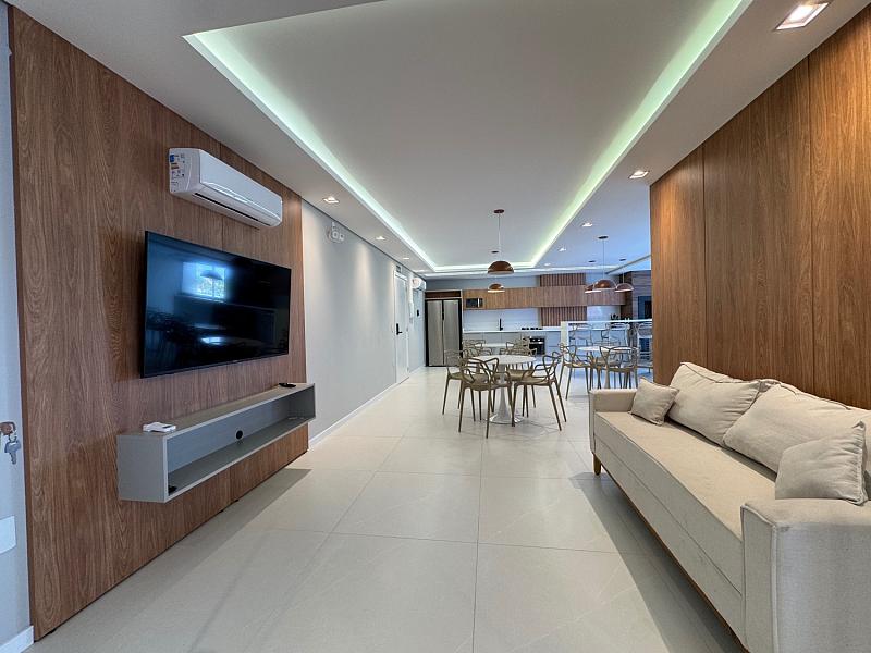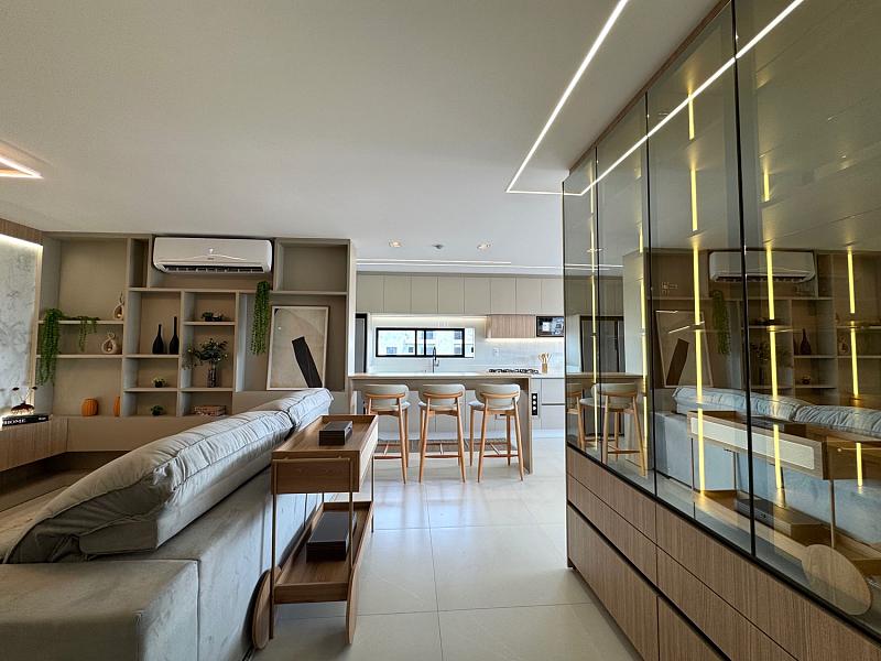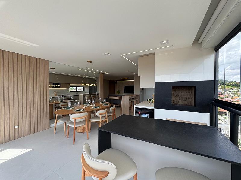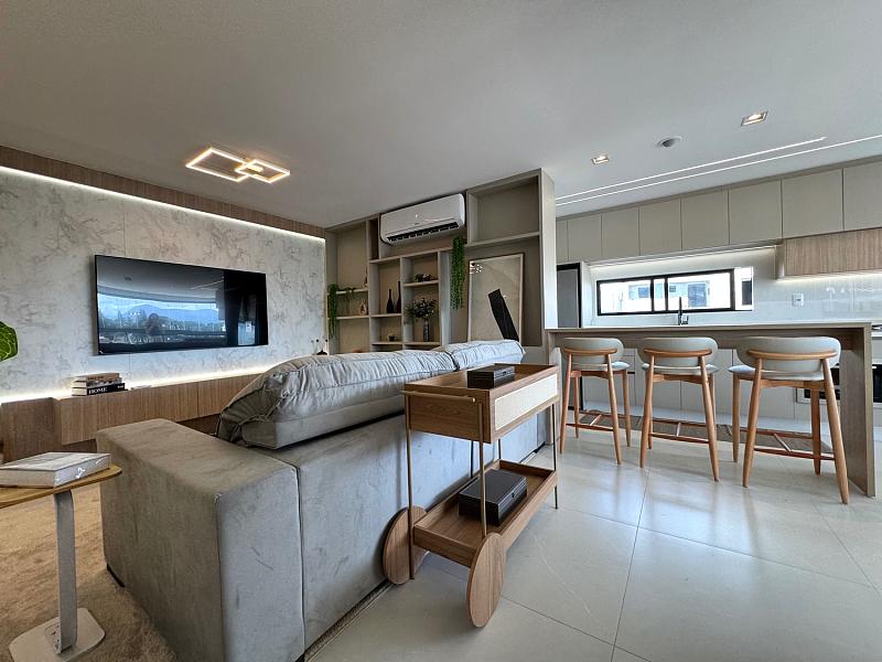 • Amplo living com sala de tv, possui um ótimo espaço de mesa de jantar com sacada integrada e churrasqueira