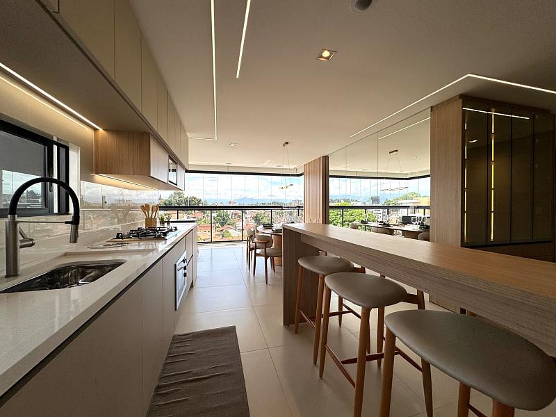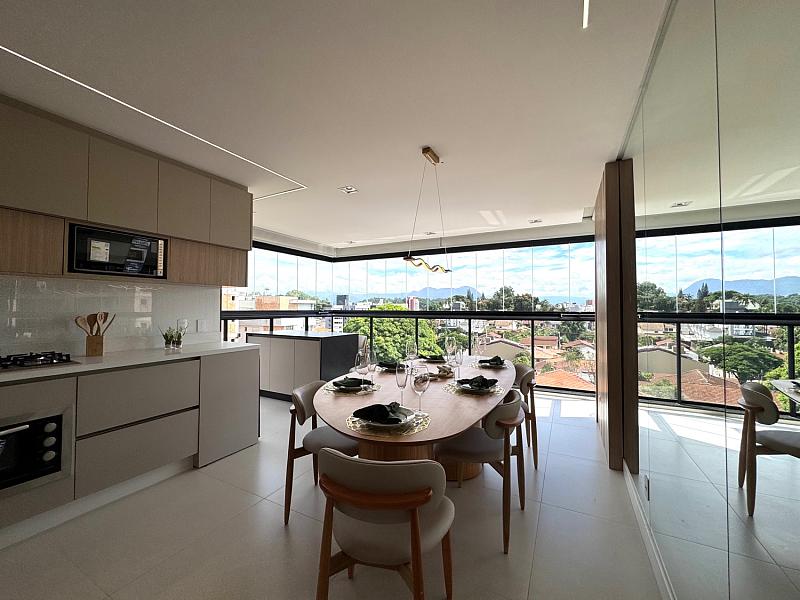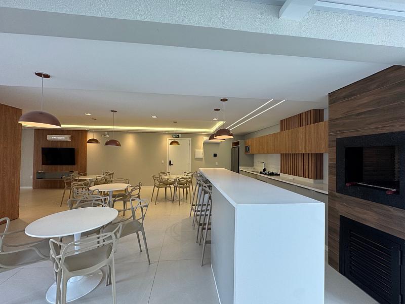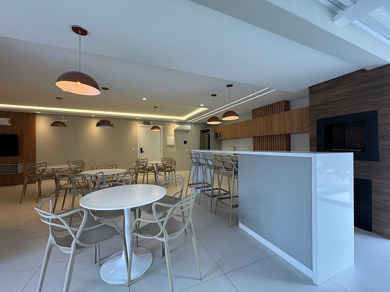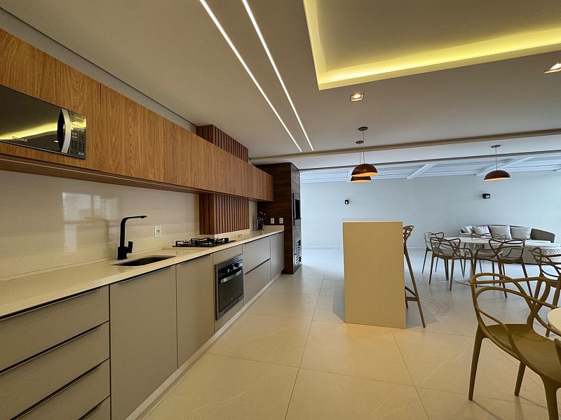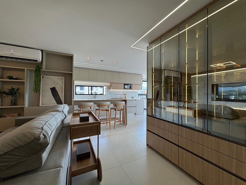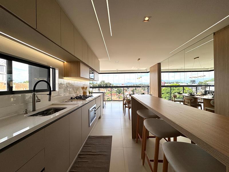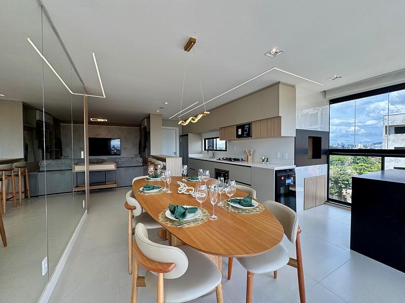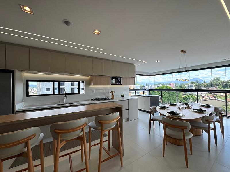 • Amplo living com sala de tv, possui um ótimo espaço de mesa de jantar com sacada integrada e churrasqueira