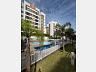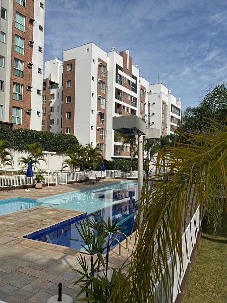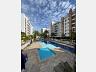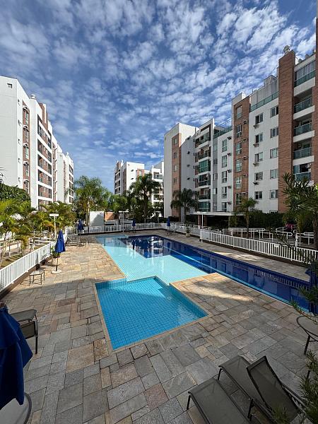 Condominio de prédios com piscina, salão de festas, quadra esportiva e academia.