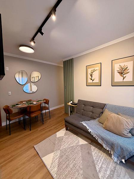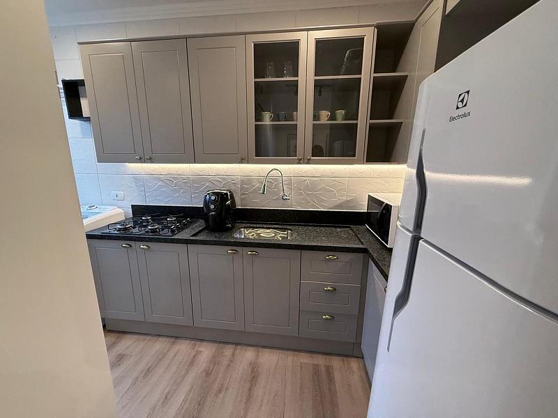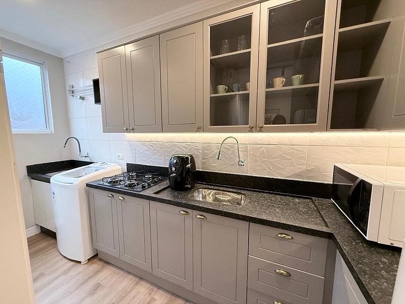 • Cozinha planejada completa com eletros, sala aconchegante e decorada com muito bom gosto. Quarto com cama box, armário e ar condicionado. Sacada com churrasqueira e fechamento em reiki. Lavanderia com máquina de lavar,TV, microondas, air fryer, utensílios e muito mais.