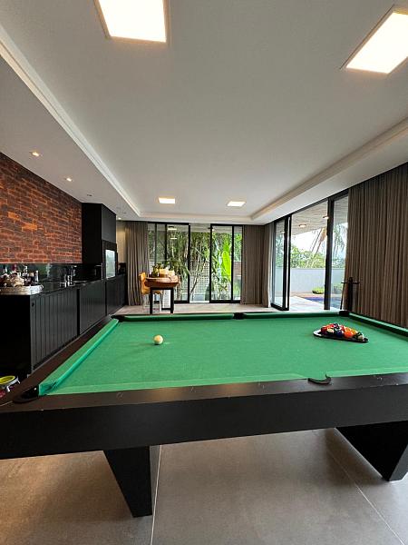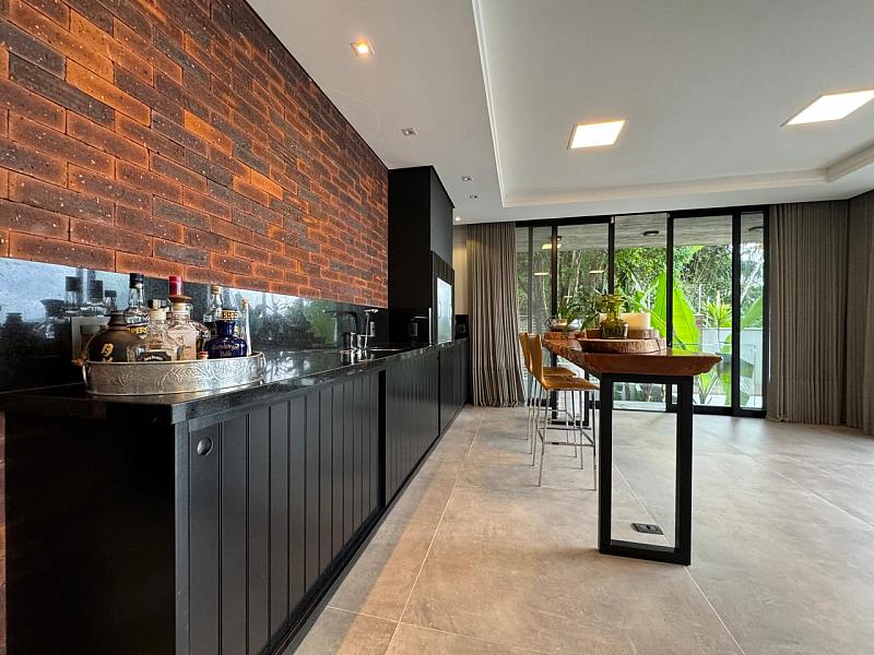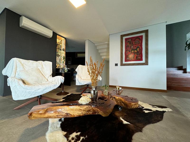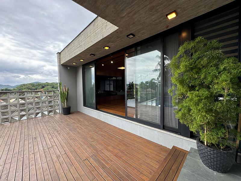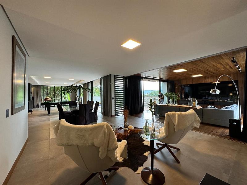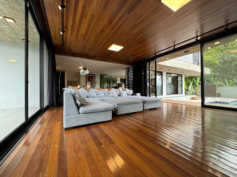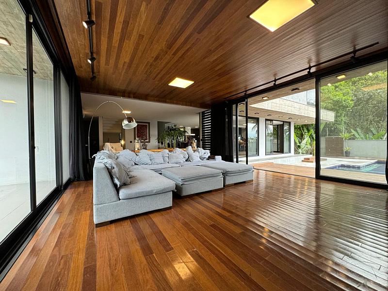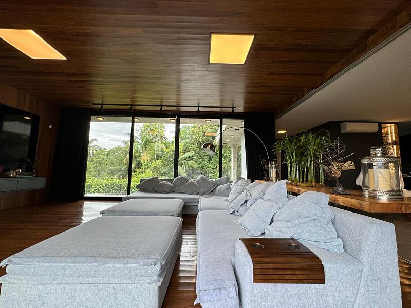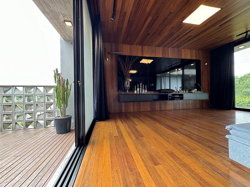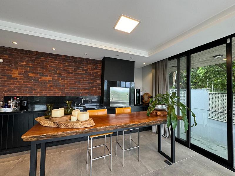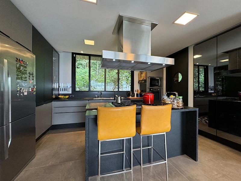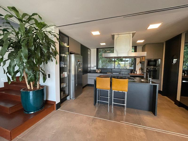 Segundo pavimento:  lavabo, sala de jantar com espaço para mesa de 10 a 12 lugares, sala de estar revestida do piso ao teto em madeira de Cumaru, escritório que pode ser revertido em um quarto, espaço gourmet com churrasqueira, sala de jogos que da visão a enorme piscina de borda infinita e deck. Cozinha da marca Formus, com coifa e fogão semi-industrial.