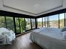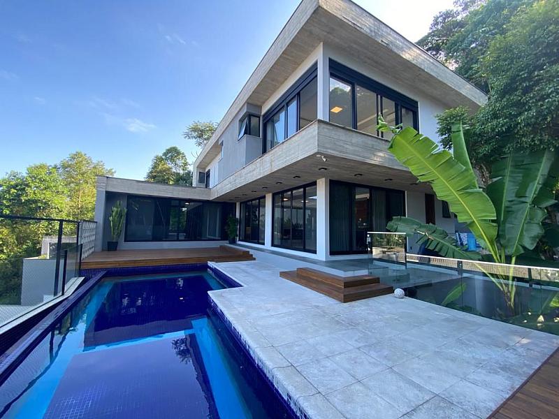 Esquadrias piso teto, piscina com borda infinita, com uma arquitetura e mobiliário moderno, em meio a natureza.