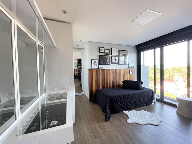 Terceiro pavimento: 02 suítes, mais 01 suíte master com 02 cubas individuais e box com dois chuveiros efeito chuva, amplo closet e persianas automatizadas. Todos os três banheiros, com piso aquecido. Uma sala acústica para jogos de vídeo game, podendo transformar em mais um dormitório . Armário projetado para rouparia.