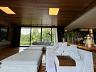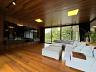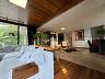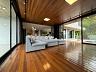 A casa é rodeada por portas francesas que tomam o lugar das paredes dando a perfeita integração do verde da área externa com o interior da casa.