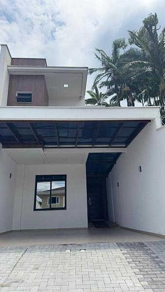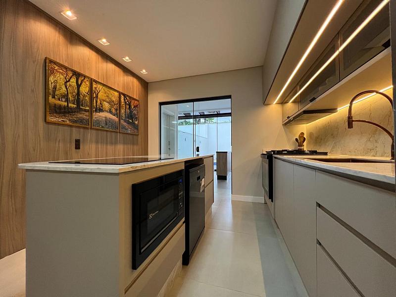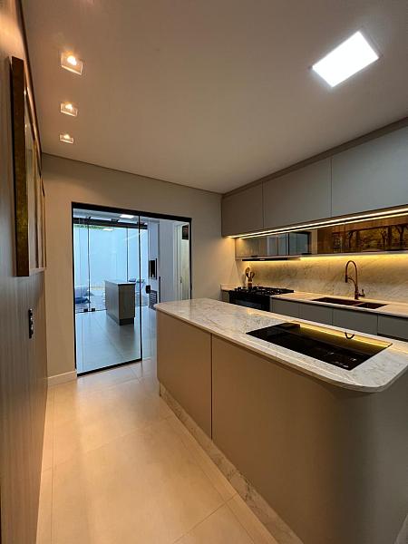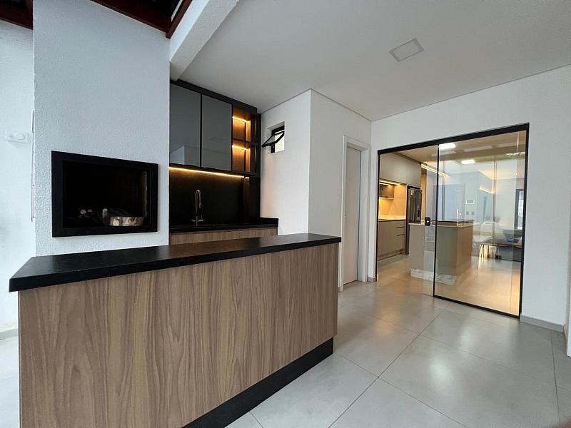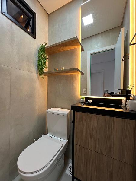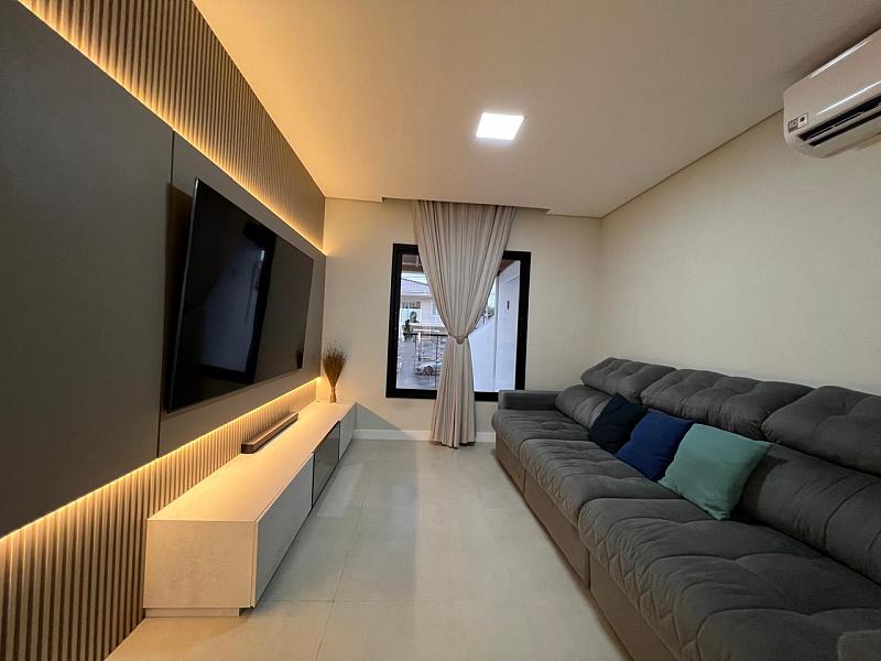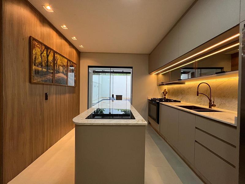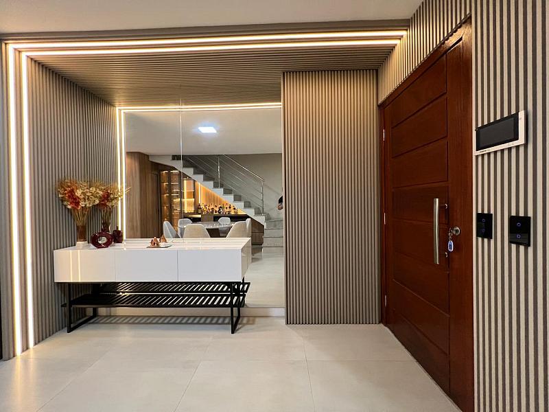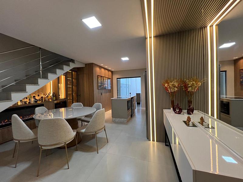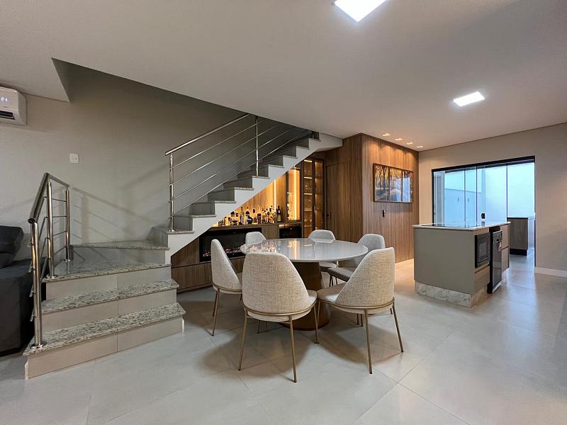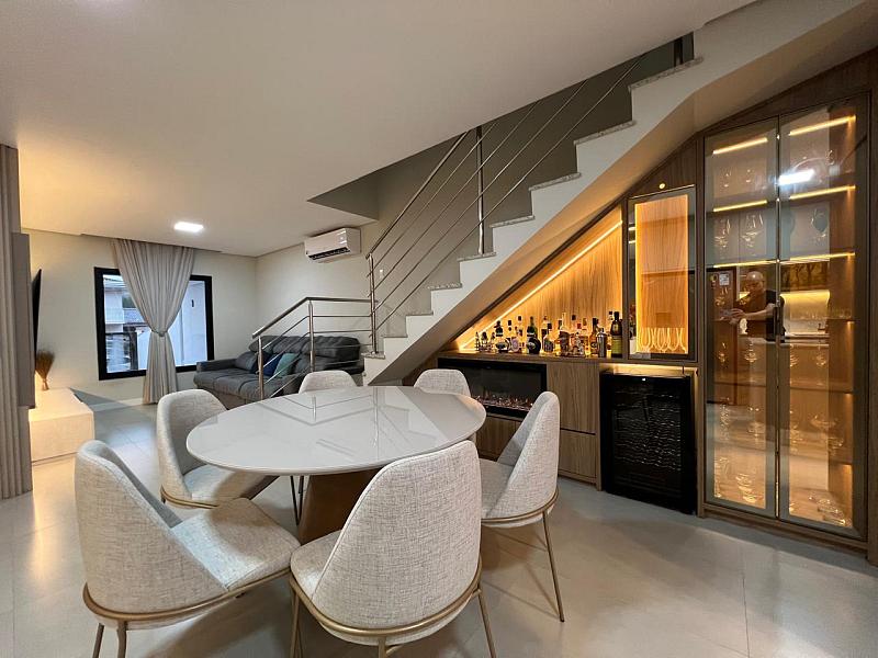 Esse sobrado conta com 03 suítes, 05 banheiros, 02 vagas de garagem, sala de estar, jantar e cozinha estão integradas trazendo um ambiente que valoriza a convivência em um espaço acolhedor.