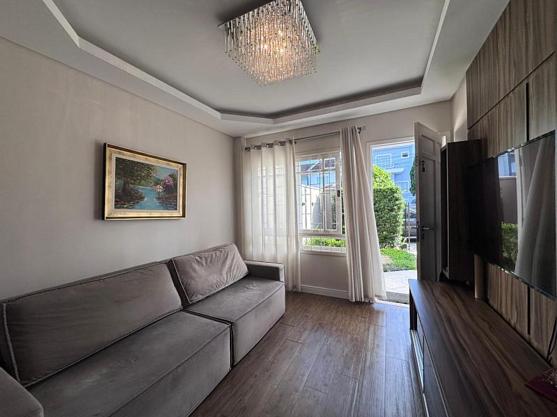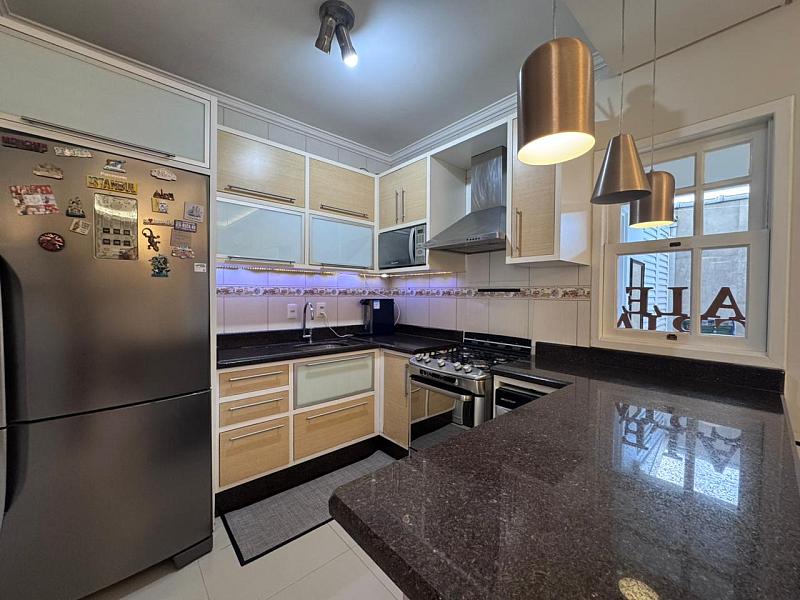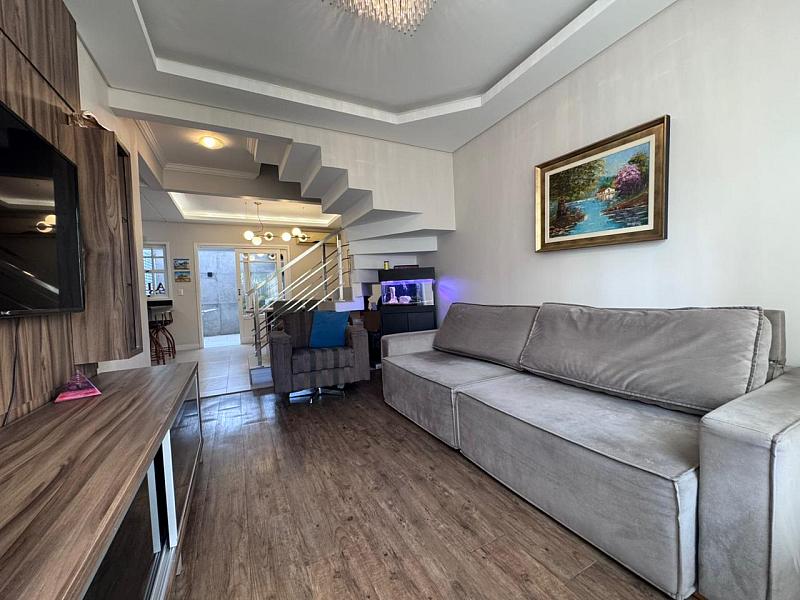 • São 125 m² construídos e bem distribuídos. A casa possui living integrado com sala de TV, mesa de jantar e cozinha com móveis planejados e eletrodomésticos, espaço nos fundos com churrasqueira e um lavabo que atende toda essa área.